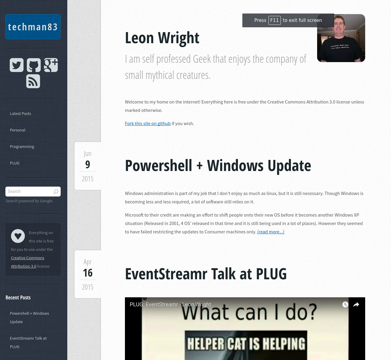 For the most part I liked the theme and the layout, however it had some issues. Primarily it was a Jekyll based site. Jekyll is an excellent static site generator written in Ruby, which was a problem when the only thing you have Ruby installed for is to generate your website. It also had a number of custom and modified gems written to extend the functionality of the site, which were all committed to the repository along with a bunch of JS libraries. All of that combined meant that I’d upgrade my computer, distro or update and something would break, then I’d have to brush the rust off my Ruby and figure it out. Which ultimately meant it got hard and I lost interest.
