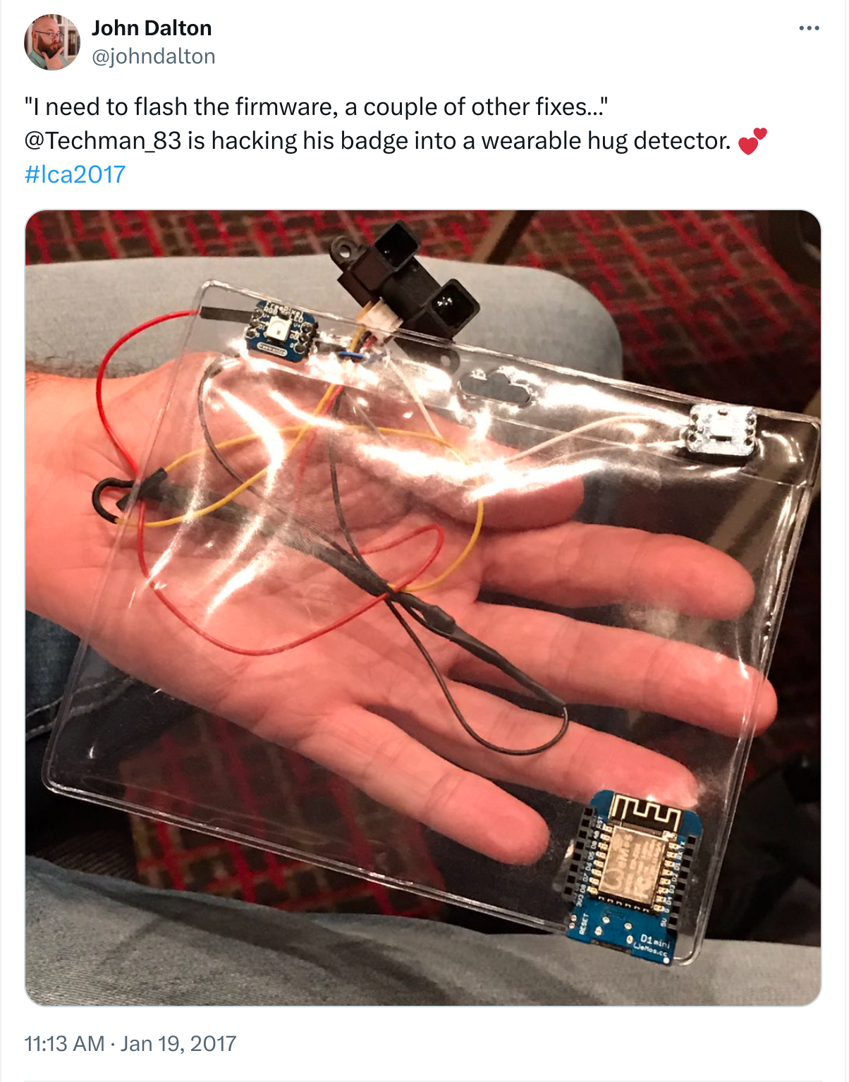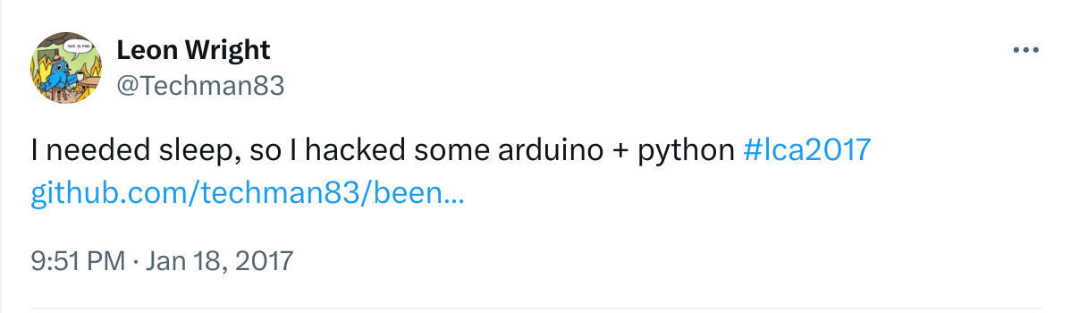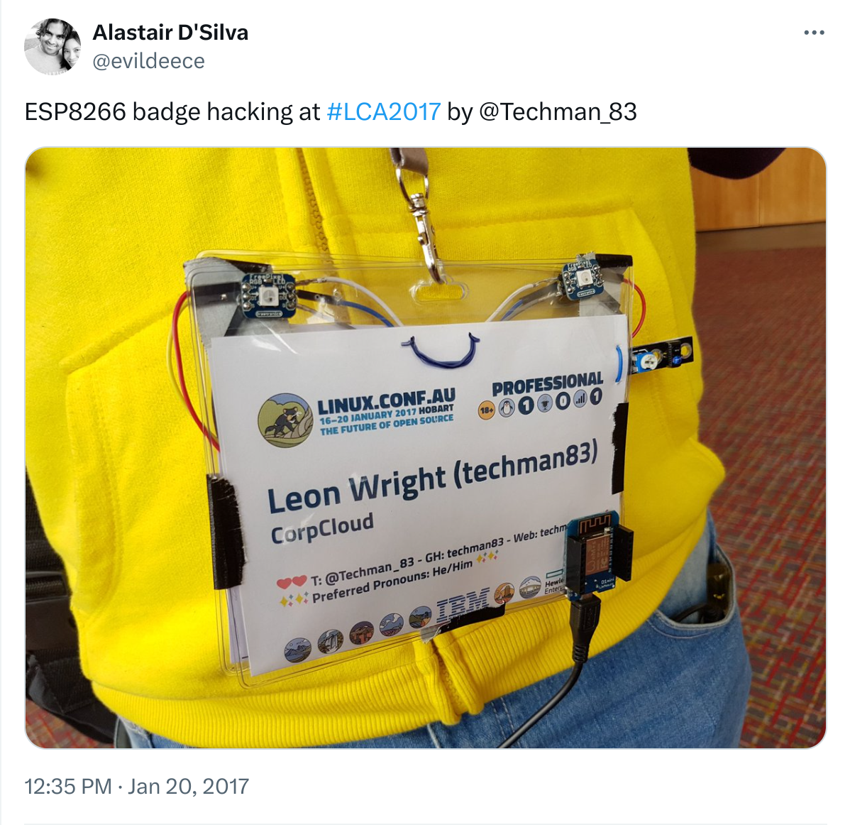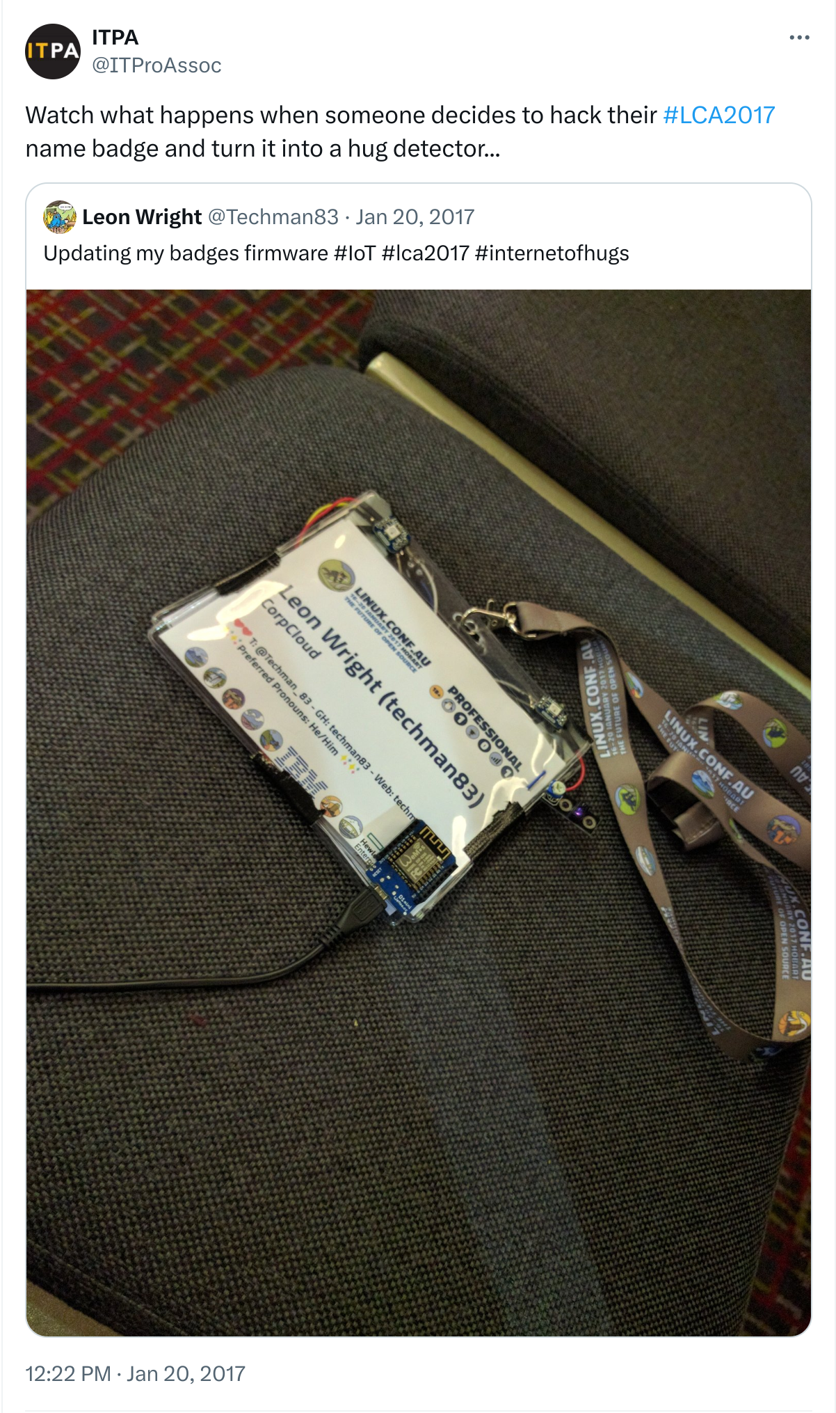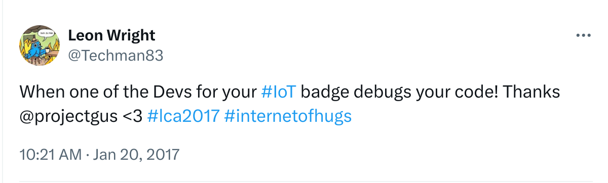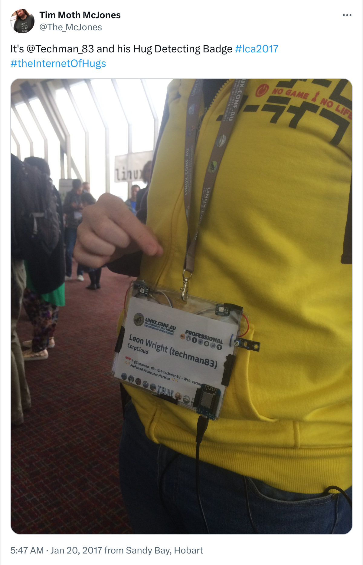 Last week was Linux Conf AU 2017, which is a community run Free and Open Source Software conference that is in a different A/NZ city every year. This year I’d managed to attend the Open Hardware MiniConf and was inspired to build something during the conference. I’m not sure how it occurred to me to build a ‘Hug Detector’ into my Conference badge, but it did and after talking about it with some fellow delegates, the feedback was overwhelmingly positive.