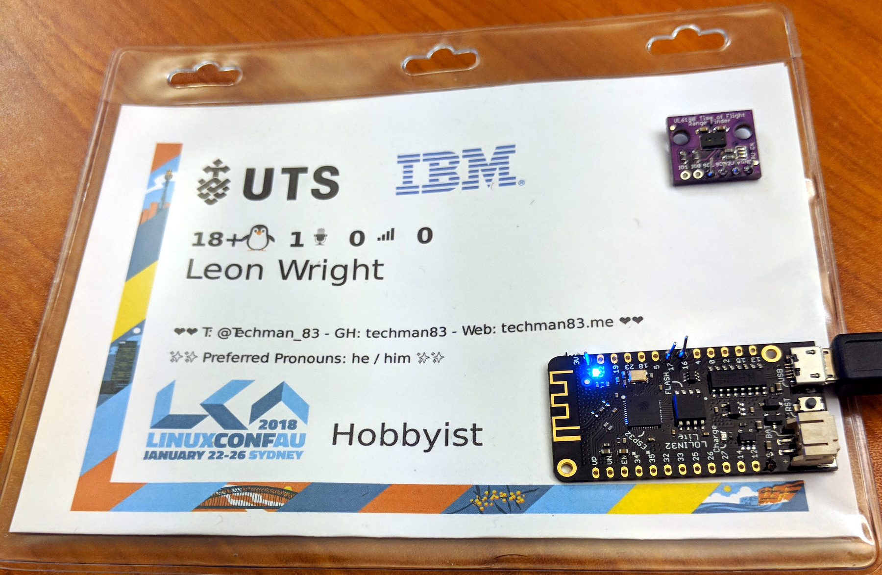 Another year, another amazing Linux Conf AU! Based on feedback from LCA2017, I was definitely going to iterate on the hug detector. In that time the ESP32 platform has begun to mature and because I like challenges, decided to use a board I received days prior to leaving for the conference and really only flashed with blink.