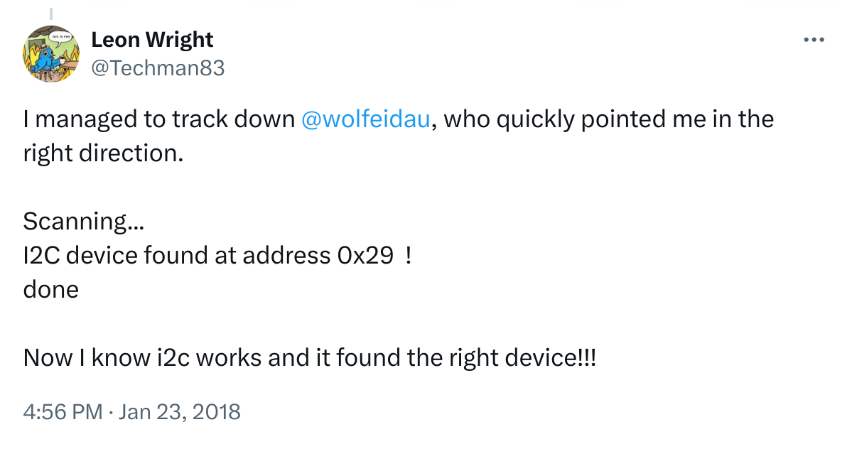 However whilst I could get it to work via the I²C scanner, I couldn’t get it to work via the library for the vl6180x lidar distance sensor that was a core part of how I would be detecting hugs this year. After a lot of flaffing around, I figured it’s a conference and hacking the library is always an option.