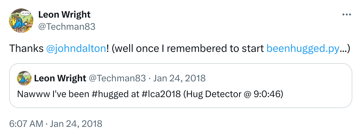 Create a dedicated hug bot account, to ensure I don’t bust my own account and also make it easier for people to filter out the hugs